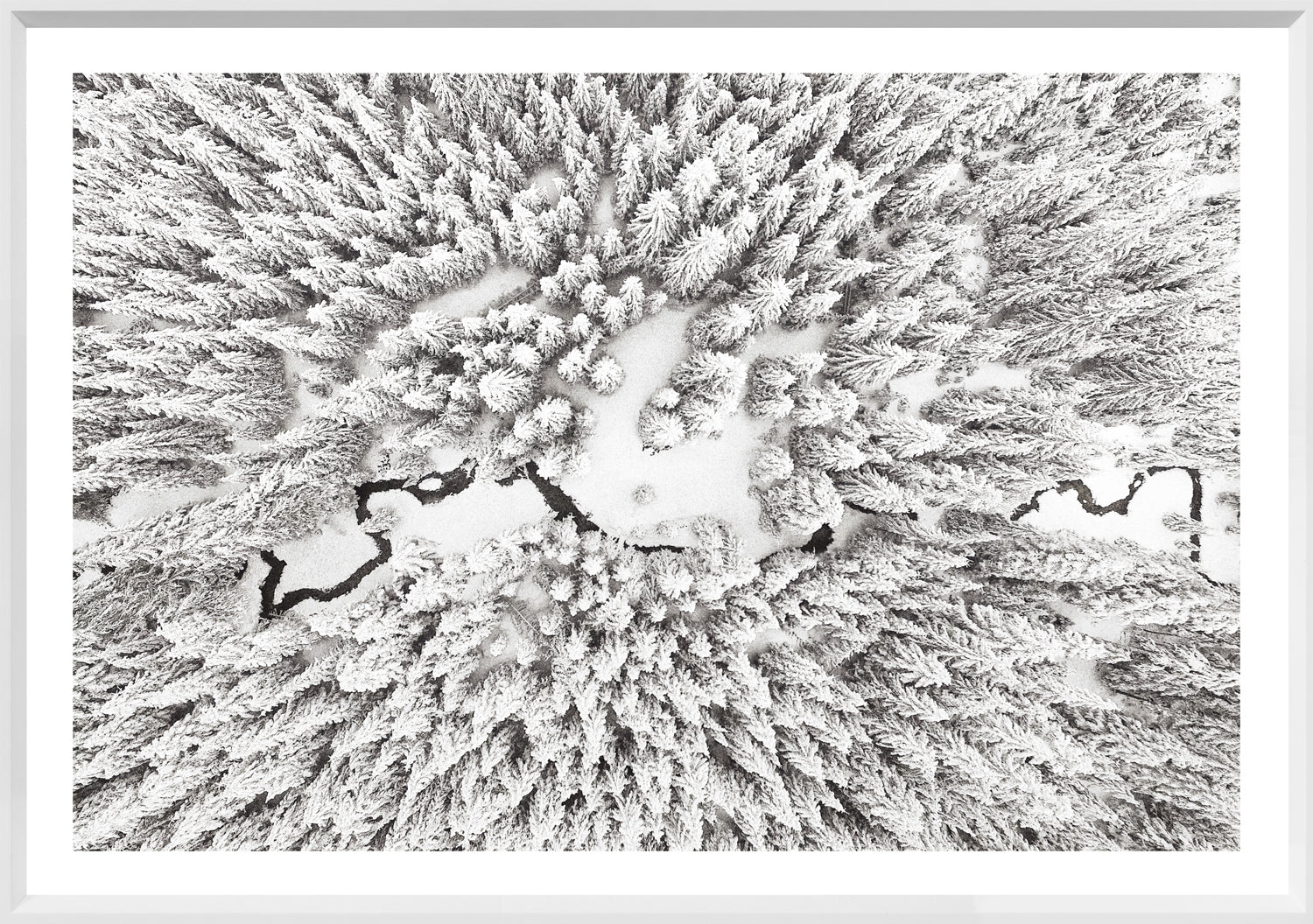 A beautifully simple aerial photograph. The strong undulating line of a stream is contrasted against open, snow-covered space and the texture of tall spruce trees. Cleanly framed in an angled white profile. One of two images available.