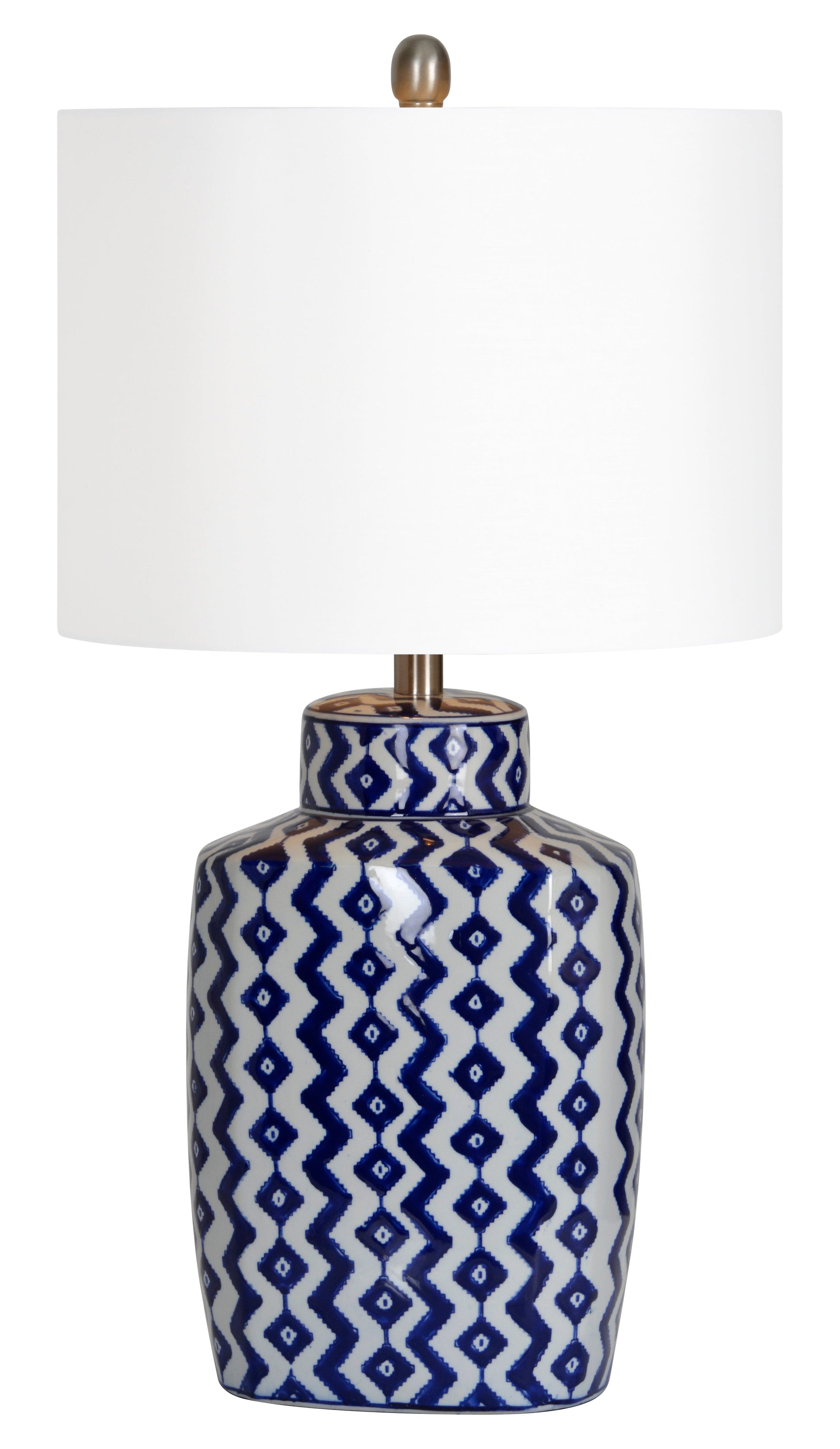Classic blue and white porcelain lamp with modern geometric design, satin nickel accents and white drum shade finish this beautiful lamp.