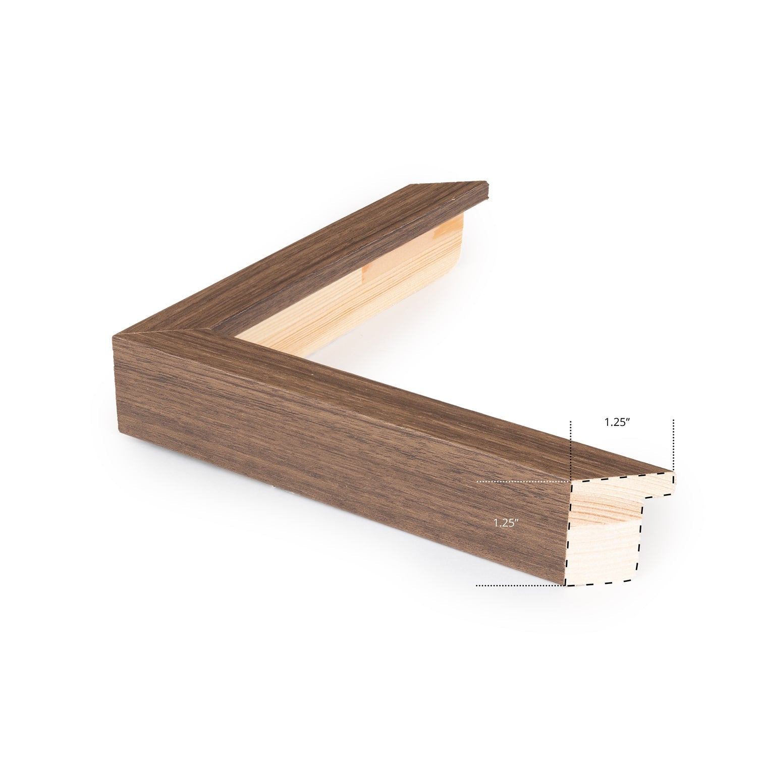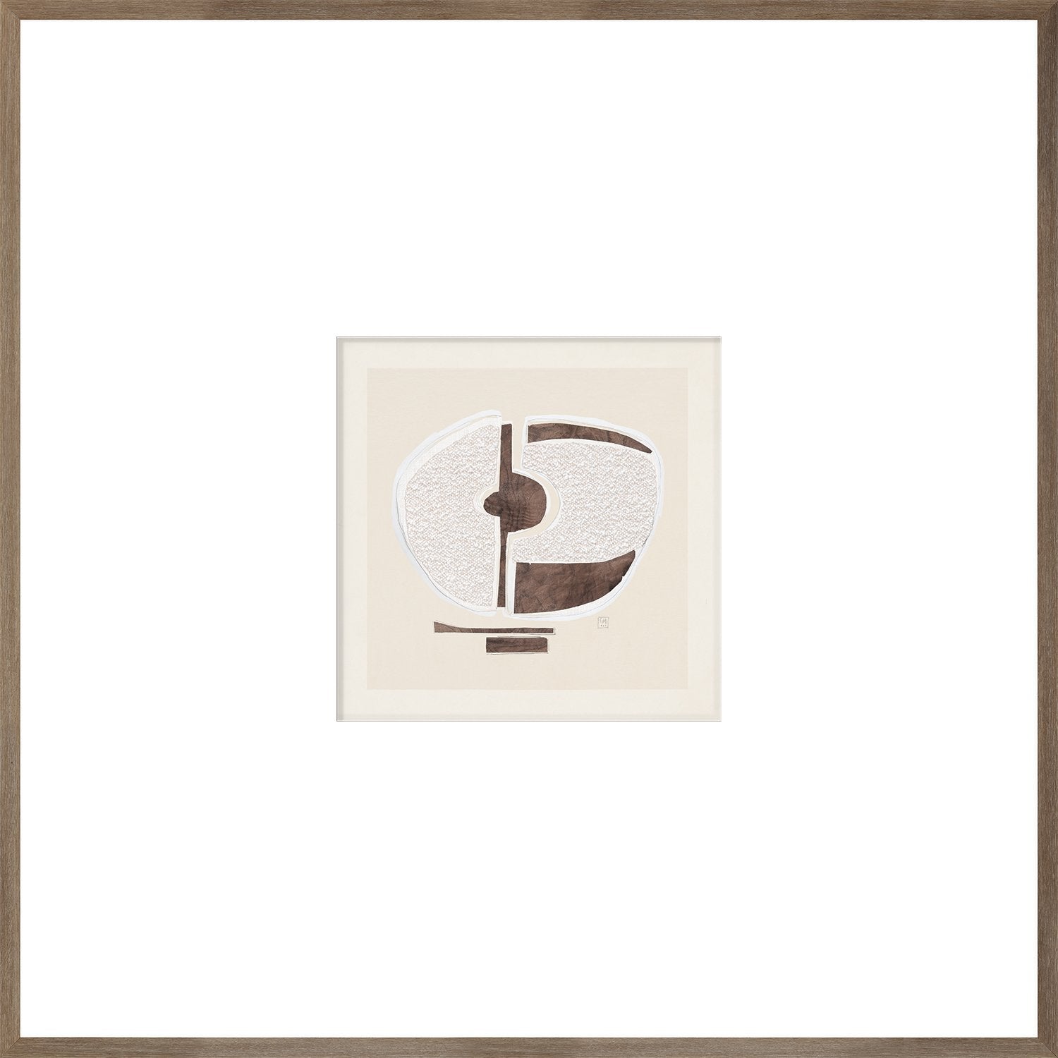 A remarkable collage-style composition using textures of boucle and veneer. Small intimate squares inside a wide matte and finished with a dark wood frame.