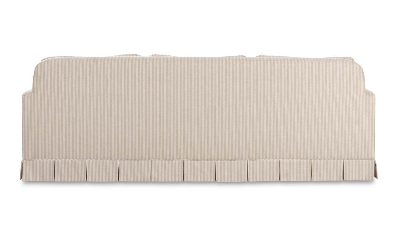 - Box pleat skirt detail, minimal track arm. Back features soft rounded corners