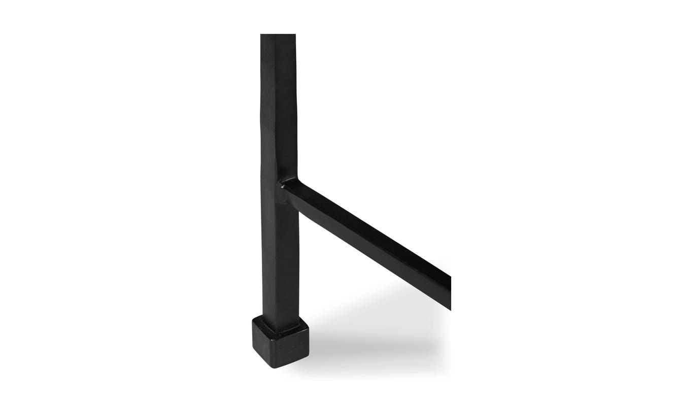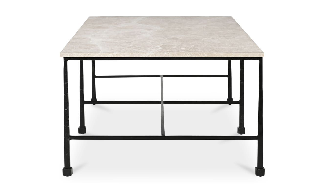 Anchored by a sleek iron base adorned with hammered details, the River coffee table's square base sculpture detail injects an unmistakable artistic flair that is crowned with a soft Italian Botticino marble top. The striking contrast of textures enhances visual interest that captivates and endures.
