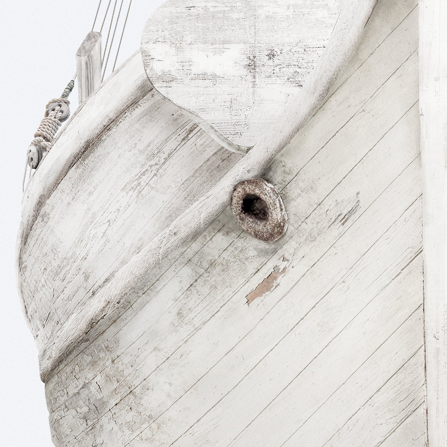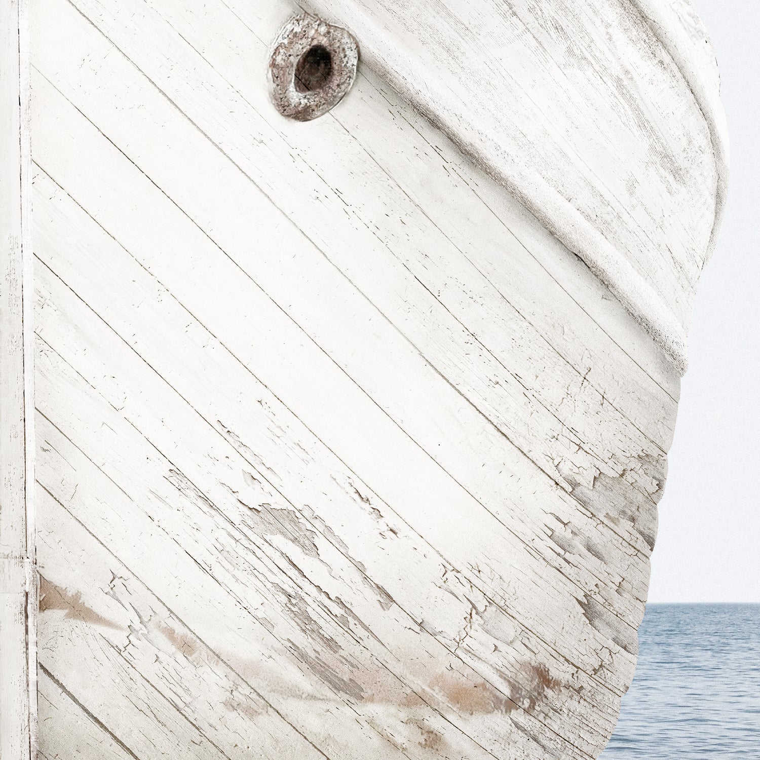 This bow of a seaworn boat features soft tones of white and ivory with the worn texture of wood showing through the paint of the vessel.
