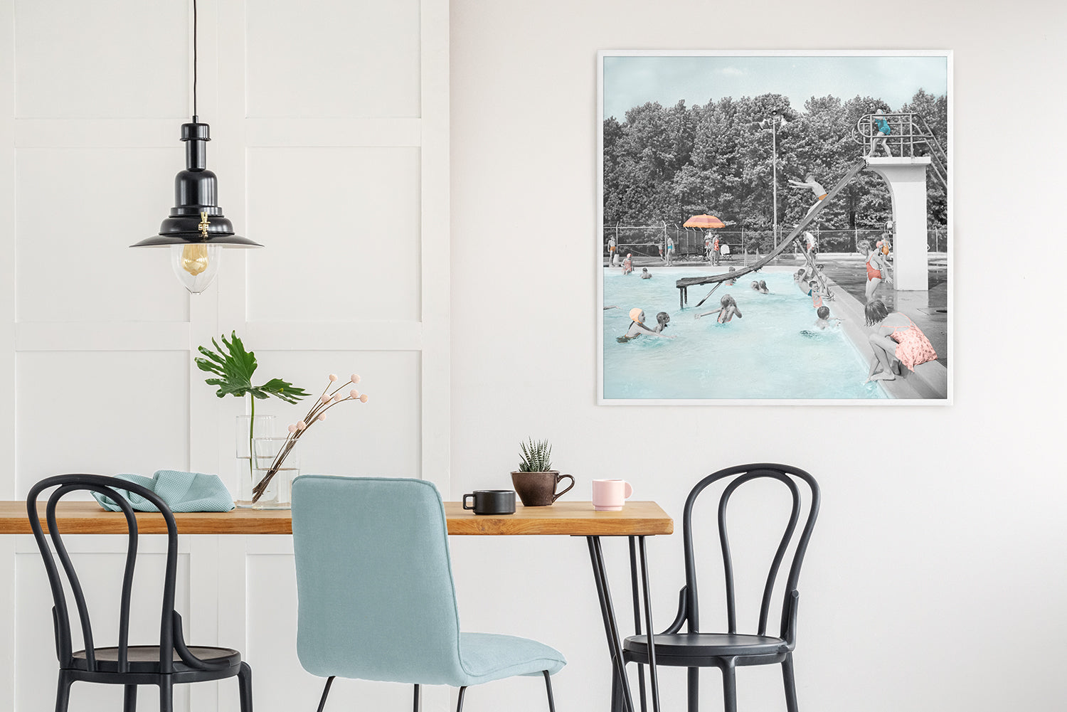Vintage photographs of idyllic fun in the pool. Accented with bright cheerful colours.