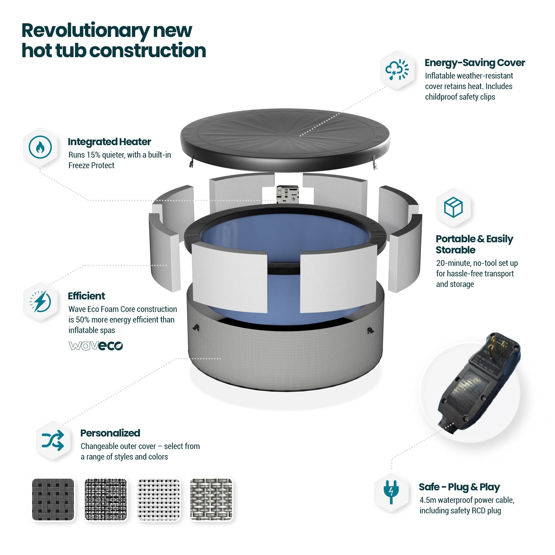 Introducing the Tahoe model by Wave – a sophisticated Charcoal Black round eco foam hot tub designed with an integrated built-in heater, delivering 50% more thermal efficiency compared to conventional models meaning cheaper running costs. Embrace a sleeker, quieter design that enhances your relaxation experience, all within its rounded silhouette.