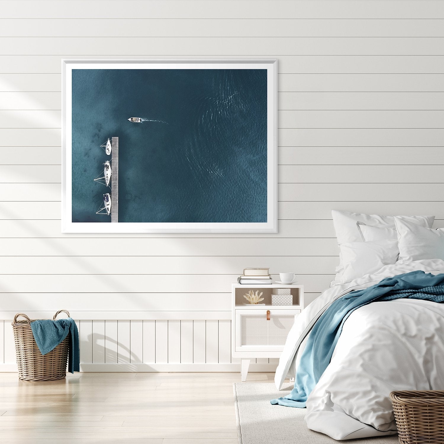 Stunning aerial view of 3 yachts tethered to a weathered dock, while a motor boat passes by. Strong, rich blues with the stark white of the yachts makes for a stunning impact