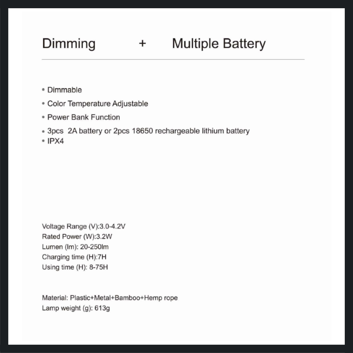 Acts as Power Bank to Charge Your GadgetsMATERIAL Plastic + Metal + Bamboo + Hemp Rope WORKING HOURS 8-75 Hours Based on Brightness CARE INSTRUCTIONS Keep it Dry BATTERY INCLUDED Yes LUMENS 20-250 WARRANTY 6 Months from the Date of Purchase against