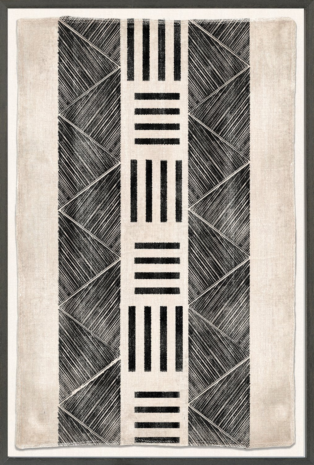 The ancient Ivory Coast technique of mud painting was used and applied to contemporary imagery to create this fascinating mix of texture, pattern and monochromatic colour. Look closely at the stitched edges and shadows beneath each of these woven treasures to fully appreciate the stunning possibilities. A Boho must.