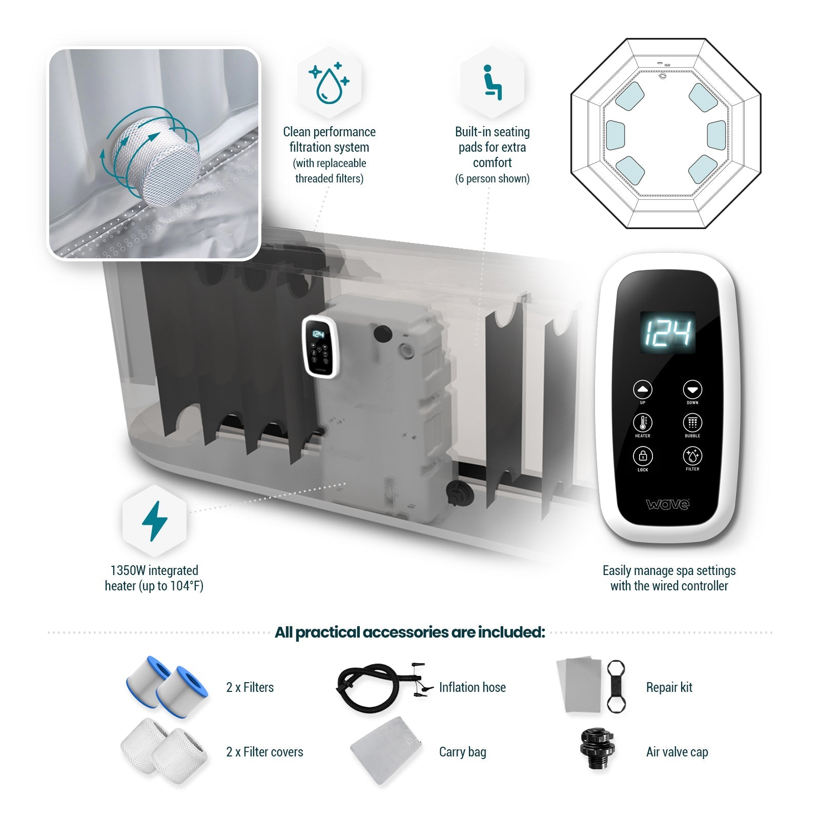 Introducing the all-new Aegean, our groundbreaking addition to the inflatable hot tub market! This octagonal marvel isn't just about its stunning new shape, which effortlessly complements any garden setting, but it also leads the pack with its advanced, integrated heater. Standing out from the crowd, this heater is ingeniously built into the walls of the spa, saving space and enhancing the sleek profile while reducing operational noise by 15%.