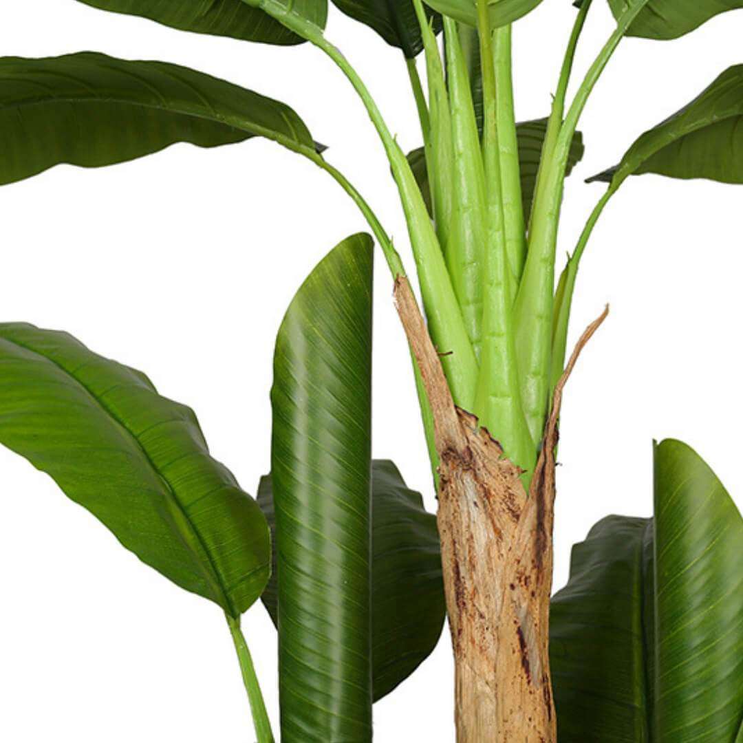 With the Anna artificial banana tree potted plant, you bring a little bit of summer indoors year-round. Zest up any home, office, or business with this true-to-life banana tree. Look closely and notice the real bark on the trunks as well as the lushly designed green leaves. Place your faux banana tree in any of our baskets or premium-made planters for the ultimate tropical summer look.