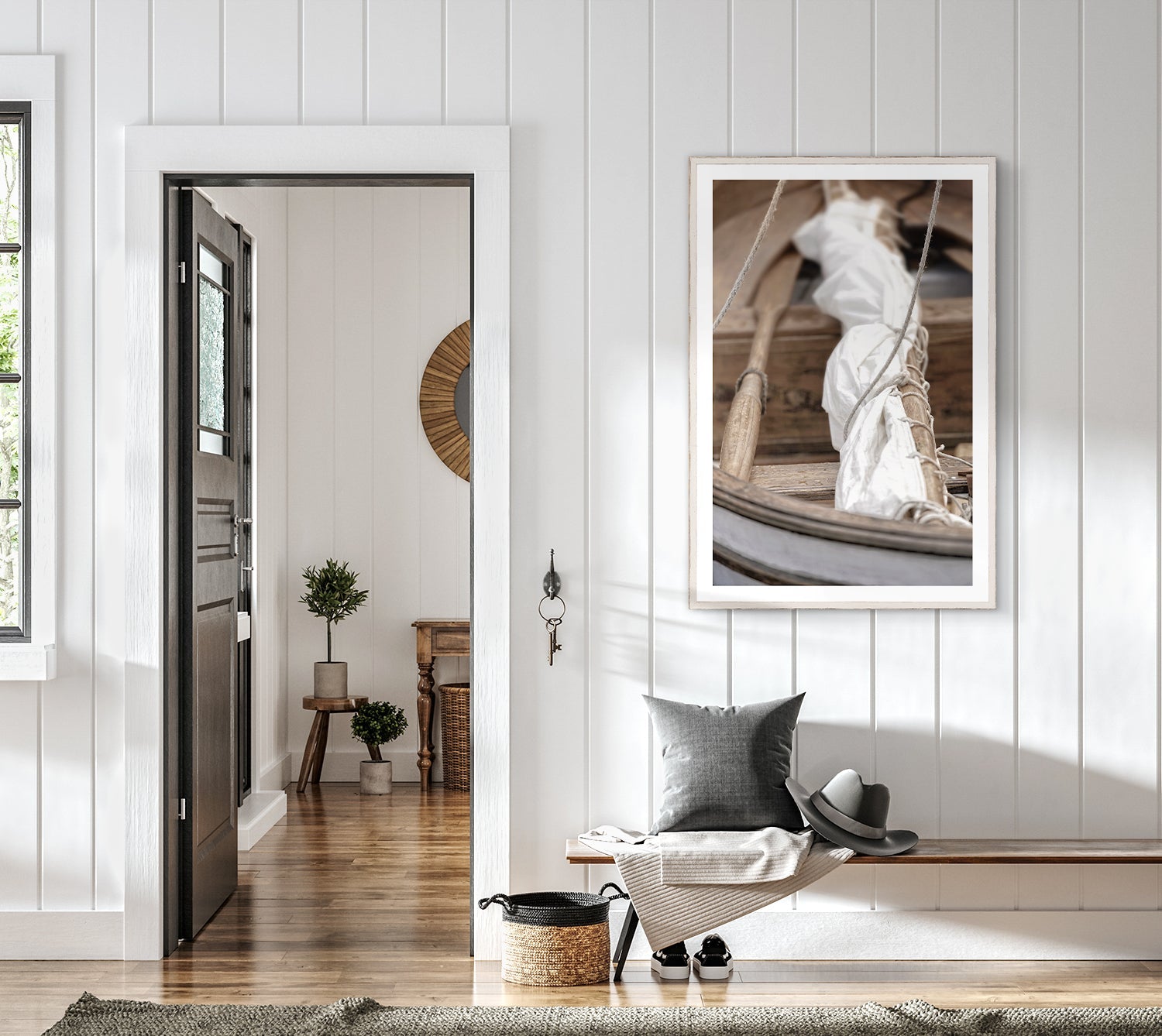 A close shot of a boat at its mooring. Focusing on the rigging of the sail and end of its paddle, this photograph puts a spotlight on the small, yet important details, finding beauty in their simplicity.