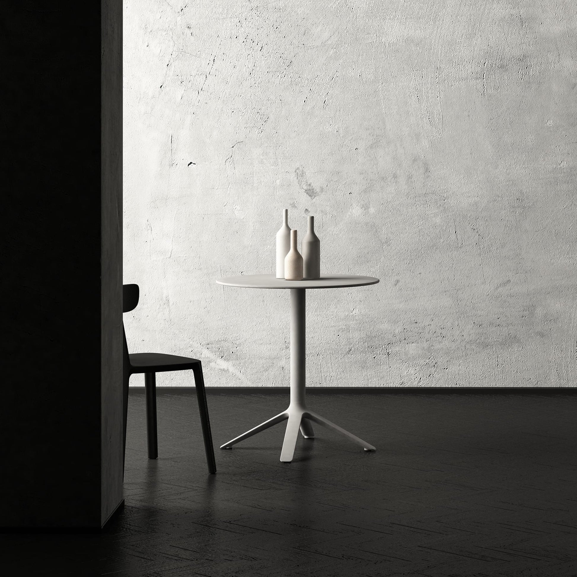 Eex presents a collection of contract tables that also have a certain vocation for domestic contexts, with square or round tops suitable for different uses: either as side or dining table, in the black, white or cool gray finish, in which plastic and metal components blend into a single colour. The top has no sharp corners or edges, and its shape is further emphasized by light, elegant outline. A soft, rounded shape that lets water drops and dew slip away, free of any grooves and unnecessary decorations, ideal for practical and comfortable use.