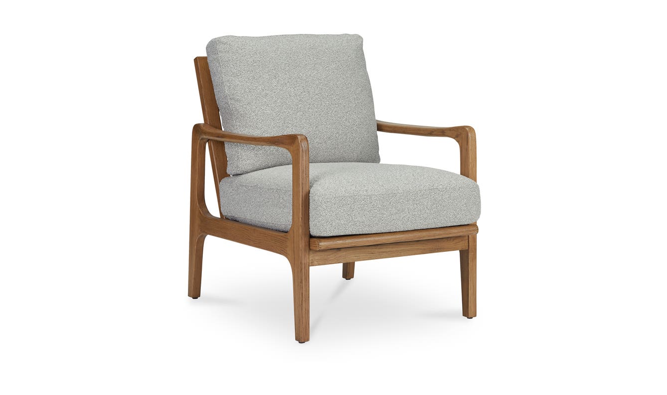 The Fearne accent chair touts a timeless silhouette that features a solid oak frame with a natural, aged finish, blending mid-century design and rustic charm. This piece is upholstered in soft-touch textured fabric to evoke a heritage feel, elegantly bridging the gap between past and present.