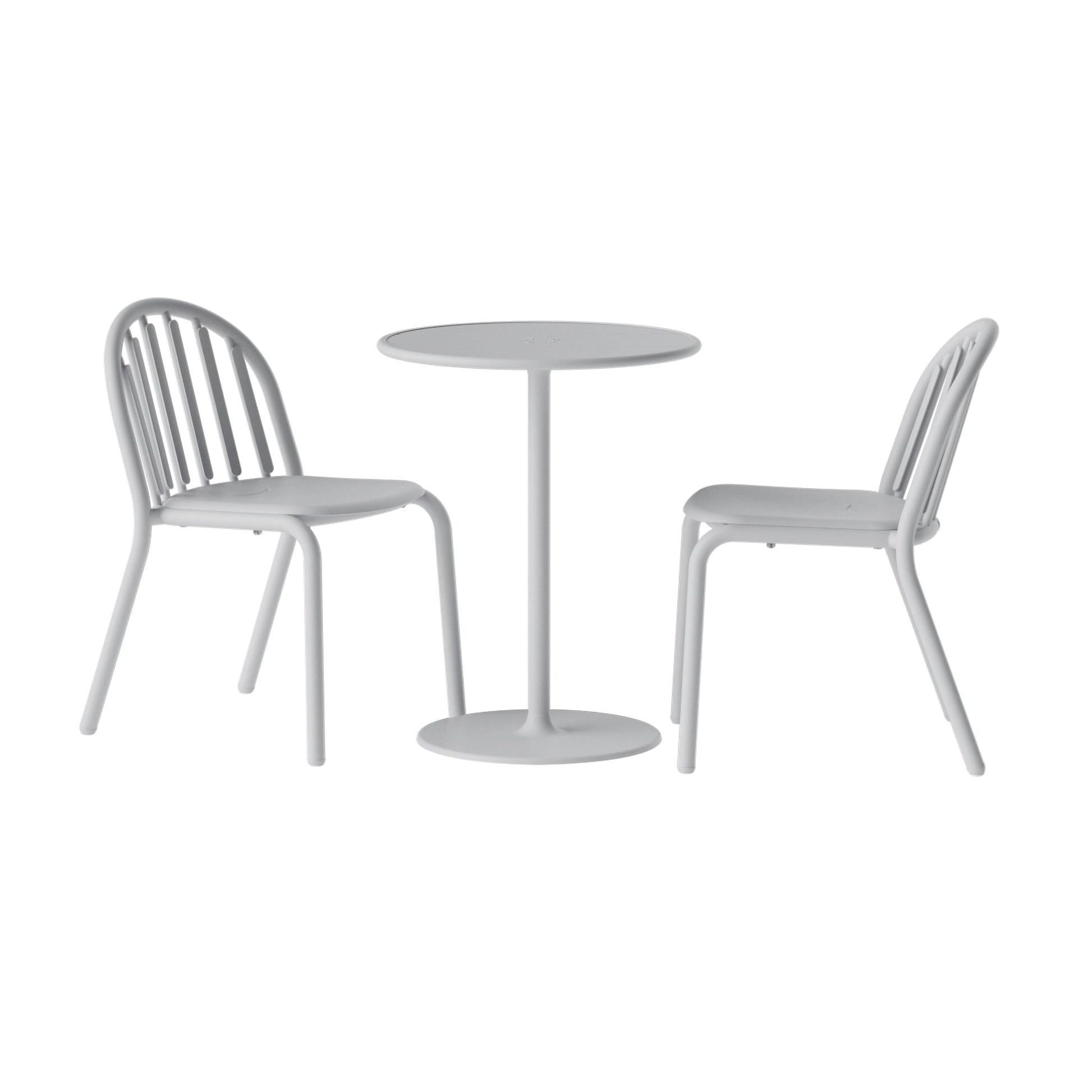 Paired with the table are two Fred's chairs, made from lightweight, weather-resistant aluminum. The chairs feature an ergonomic curved seat and flat back slats for optimal comfort, as well as a smile-shaped opening to allow rainwater to drain quickly. Their stackable design makes them practical for easy storage.