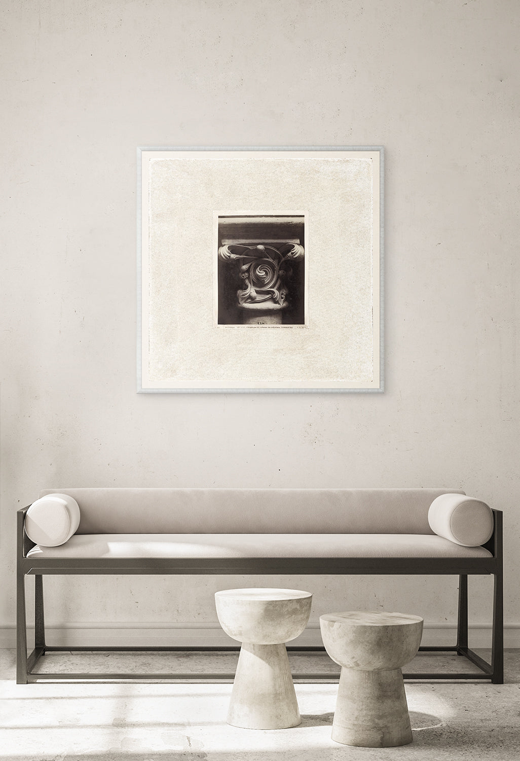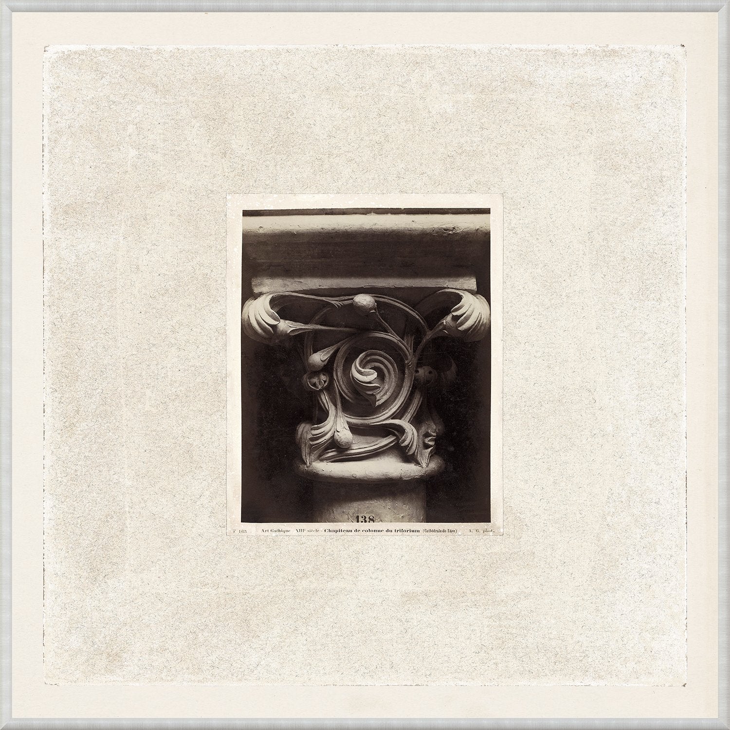 Dramatically-lit photos of Gothic architectural stone details, presented with archival marks included and a beautiful aged look. Finished in an antique ivory coloured frame with a detailed texture.