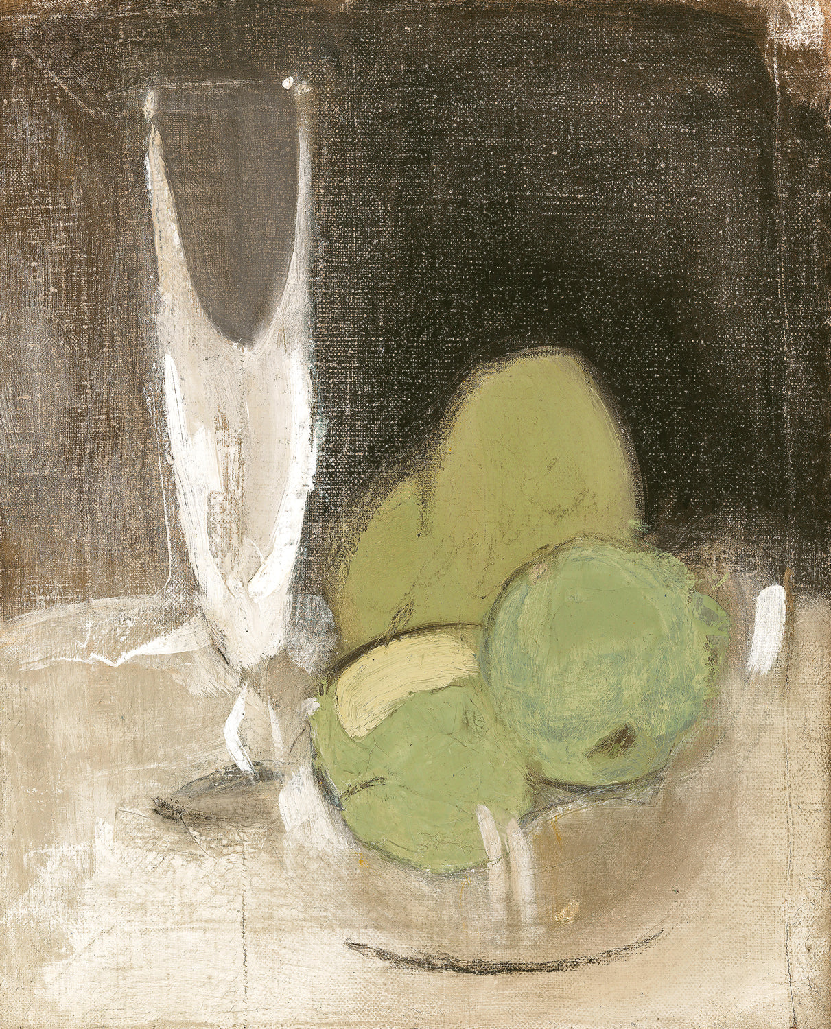 A still life from the 20th century depicting a glass of champagne and a bowl of green apples. Loose brushstrokes create the impression of shadows and highlights while keeping the forms of the objects imprecise and hinting at different textures, like the shine of glass.