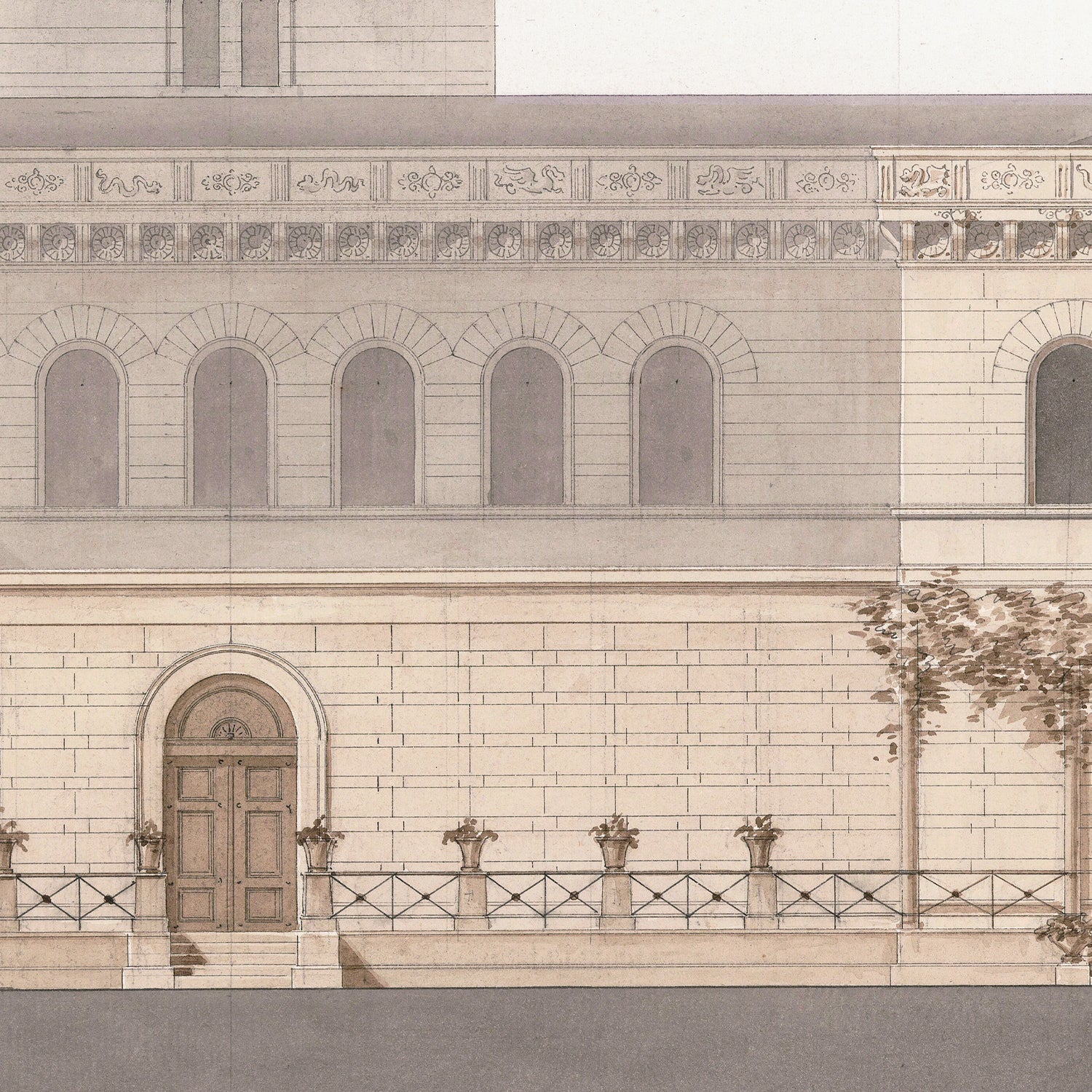 Impeccable detail and warm hues bring life to this architectural elevation of an Italian villa from the 19th century.