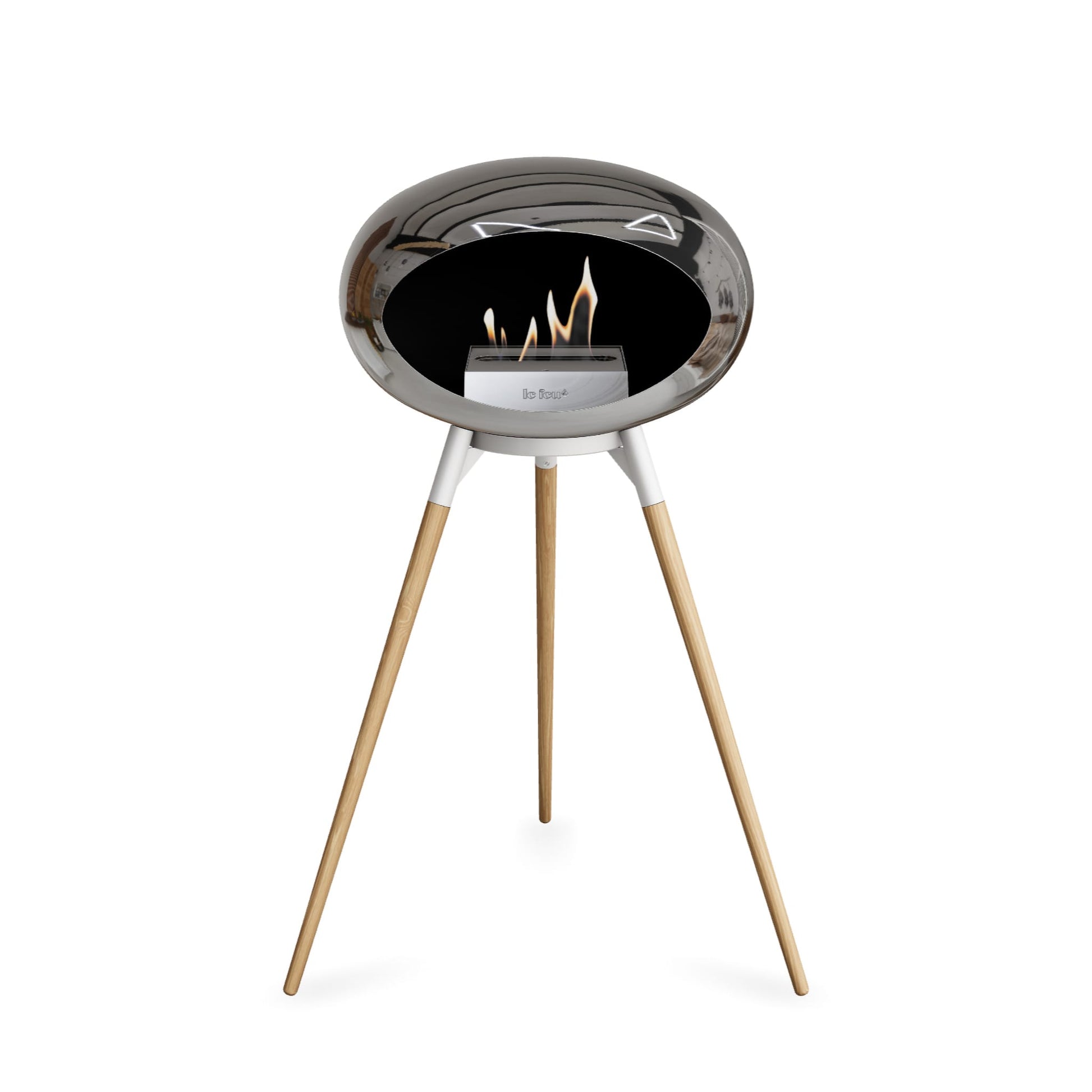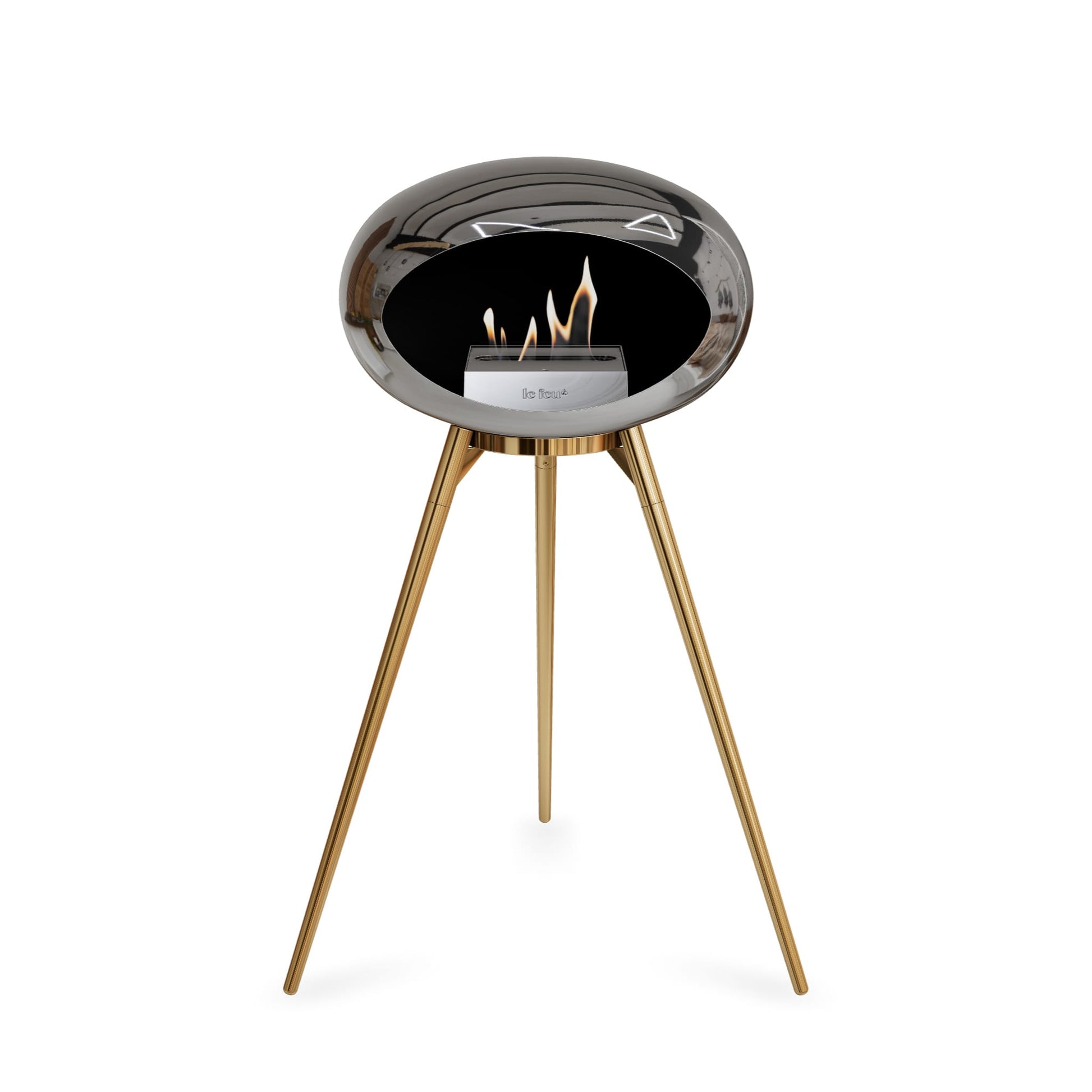 Sleek and contemporary, the Le Feu Ground High in Chromed Silver brings a striking, polished finish to your living space. The reflective dome surface catches the light beautifully, creating a dynamic visual effect that enhances the warm glow of the flame.