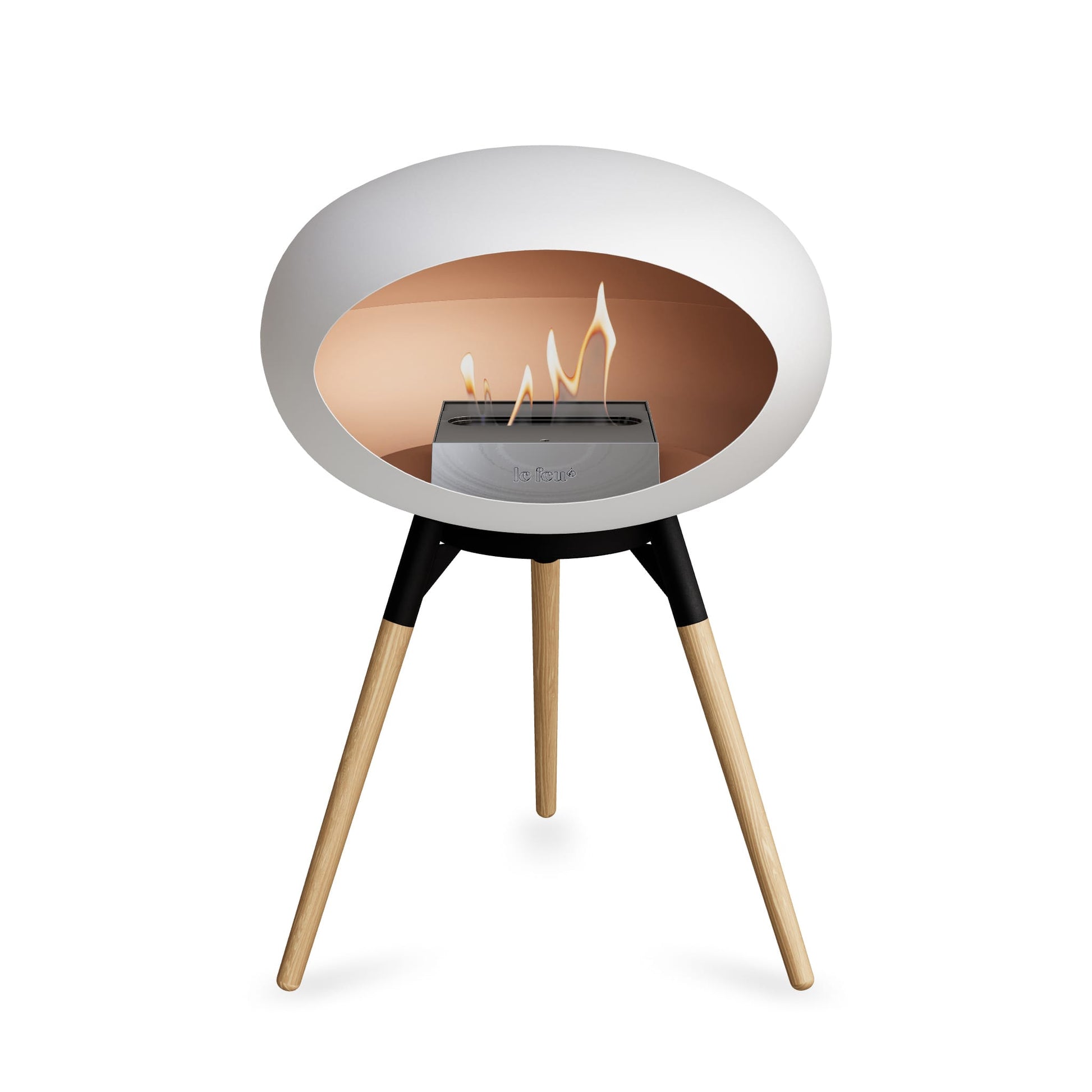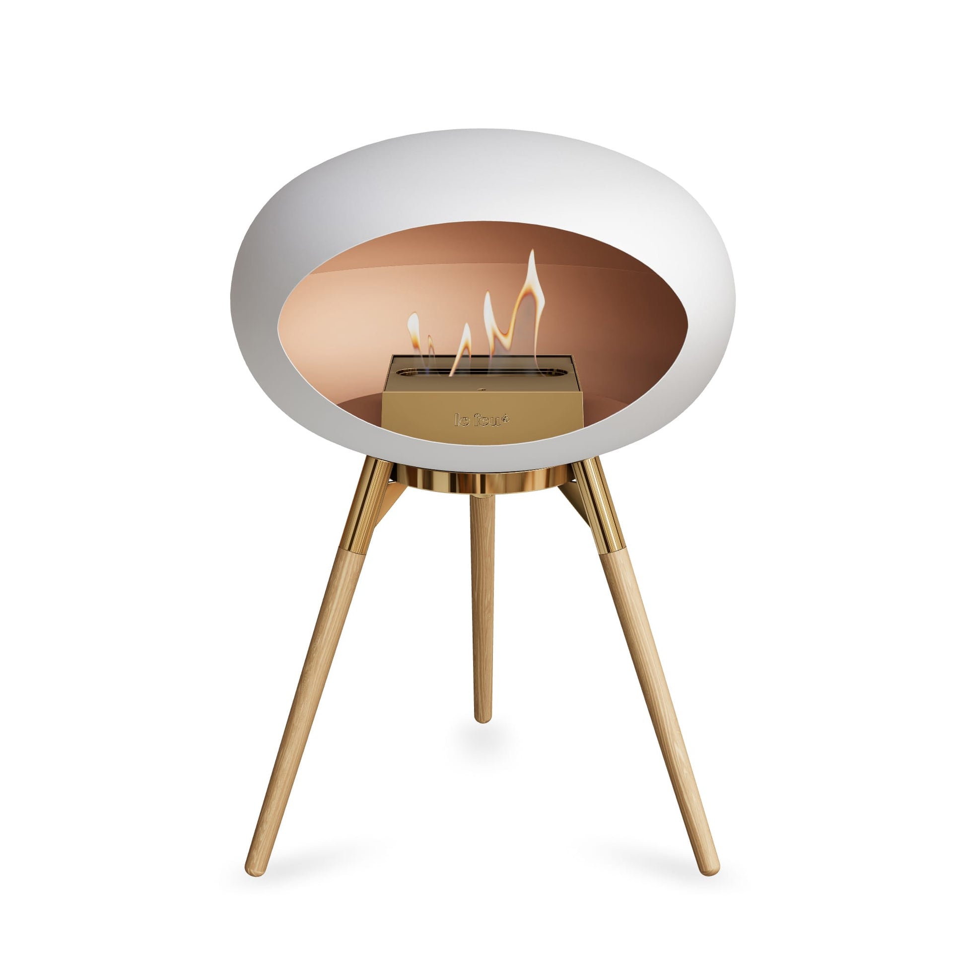 The dome, finished in matte white, reflects a soft, welcoming light as the fire burns inside. Standing on 45 cm handcrafted legs, the Ground Low sits lower to the ground, making it an excellent choice for patios, balconies, rooftop terraces, or cozy indoor corners. Despite its size, it offers the same clean-burning efficiency as larger models: no chimney or installation needed. The legs are available in Smoked Oak, Soaptreated Oak, Black Oak, White Oak, or Rose Gold, giving you the flexibility to match the style of your space, whether you’re going for something understated or bold.