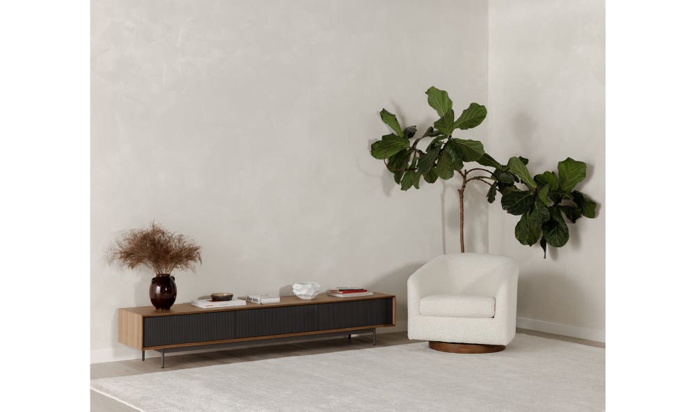 Light and cheerful. Calm and relaxed. The Oscy swivel chair is a cloud of comfort that brings airy energy and convenience into your living room with its 360° swivel, floating base design. Idyllic for a reading nook or as an accent chair, the Oscy creates a chic retreat with vegan shearling upholstery that looks fresh and feels cozy.