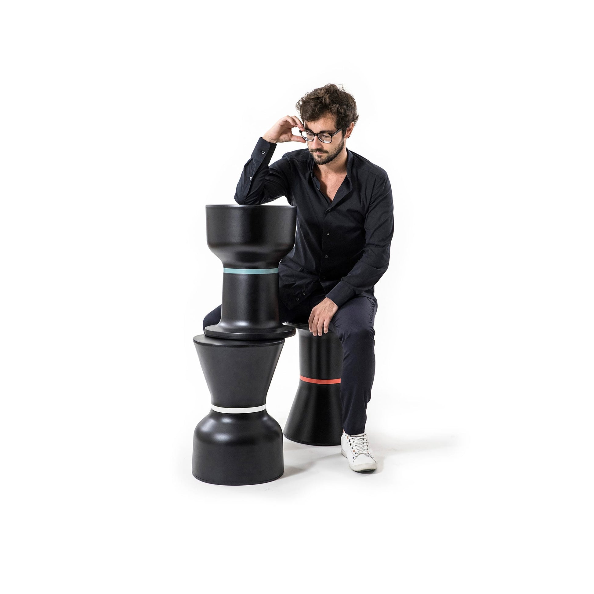 Essential yet non-simplified volumes, cross-references to well-known shapes, seen and recorded in our memories as archetypes of vases, columns, and capitals. These objects stand out almost undefined for their usage, therefore completely free to suggest different purposes reinterpreted from time to time. Put a book on it nearby a bed and it will become a nightstand; a cocktail by a pool will make it an outdoor table; inside the house or in a bathroom it could turn into a stool, while in a restaurant or café it could serve as a bag holder.