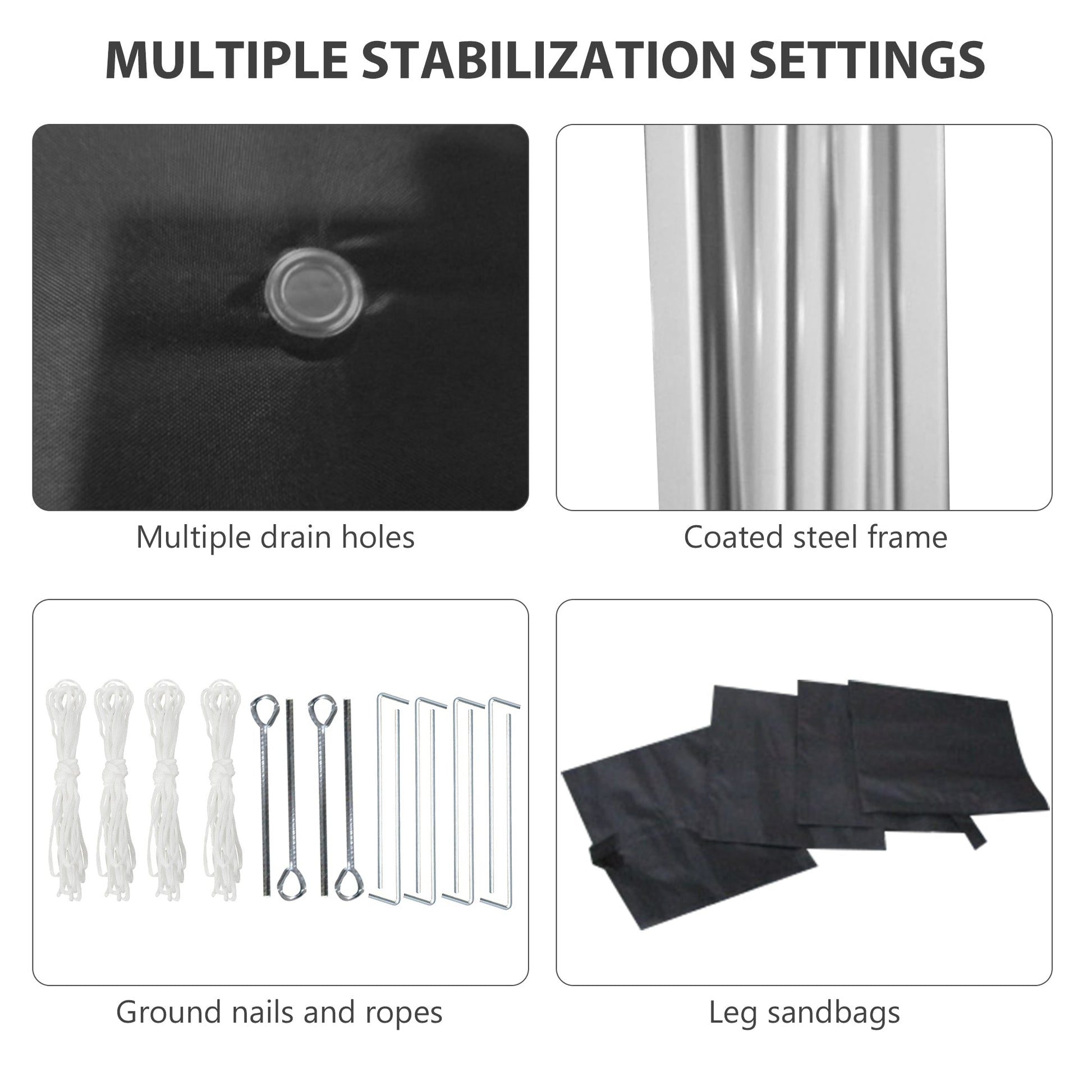 Durable & Stable: Includes ground nails, ropes, 4-leg sandbags, and a coated steel frame for added stability. Drain holes prevent water accumulation.