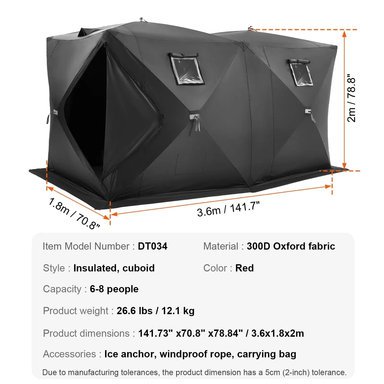 關於VEVOR Portable Ice Shelter, 6-8 Person Pop-Up Ice Fishing Tent, 70 Square Feet Fishable Area, Ice Shanty for Winter Fishing, Waterproof Oxford Ice Cube with Anchors/Ropes/Carrying Bag, 142"x71" Black